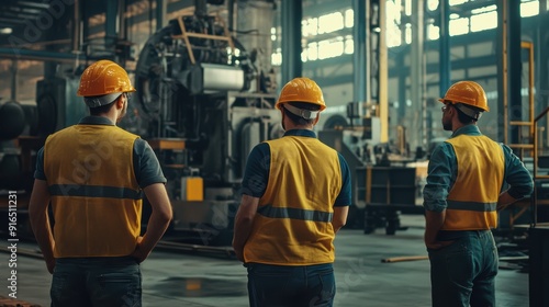 Professional Team of Workers in Helmets and Vests Maintaining Factory Equipment