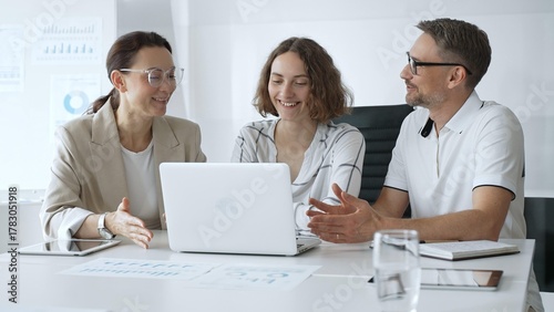 Professional team reviewing project data on laptop, working together in modern office environment, collaborating with focused corporate energy. Business people concept
