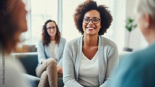 Professional therapists conduct an open group session and a comforting smile, emphasizing the importance of mental health and counseling. Generative ai
