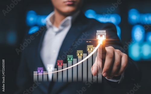 Professional touching a futuristic digital screen with a growing bar graph of property icons, symbolizing success in the real estate market, housing investment, and asset appreciation