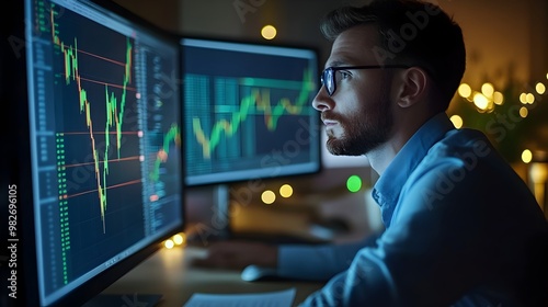 Professional Trader Analyzing Market Data on Multiple Computer Screens in Office