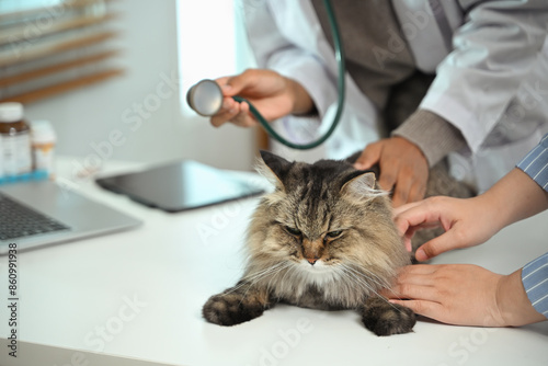 Professional veterinarian with stethoscope examining Maine Coon cat at veterinary clinic. Pet health care concept