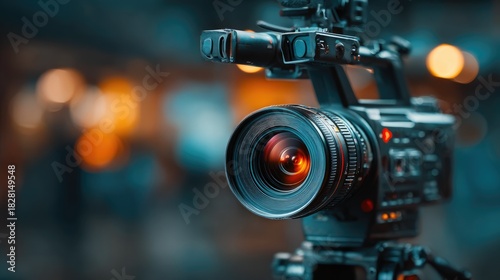 Professional Video Camera Lens Close-Up with Bokeh Lights
