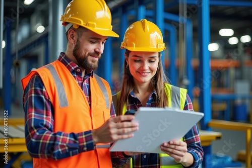 Professional Warehouse Workers in Safety Gear Discussing Plans on Tablet