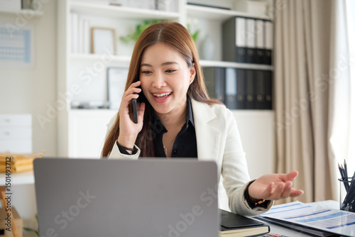 Professional woman engaged in a cheerful call while working remotely at her desk, expressing communication, connection, and positive business relationships.