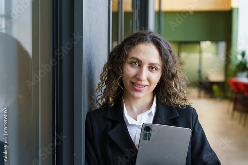 Professional woman engaging with technology at a modern indoor workspace during daytime while exuding confidence and approachability