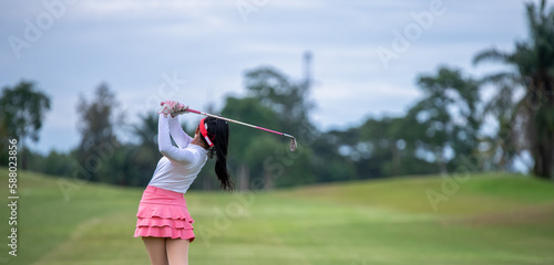 Professional woman golfer teeing golf in golf tournament competition at golf course for winner
