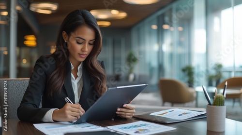Professional Woman in Business Attire Analyzing Data on Digital Tablet While Sitting in Modern Office Environment