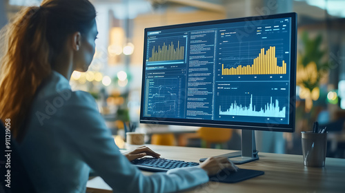 Professional Woman is Engaged in Analyzing Data on a Computer in a Modern, WellEquipped Office Environment, Showcasing Expertise