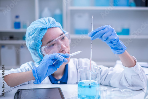 Professional woman specialist doctor laboratory white uniform use thermometer temperature on blue liquid in healthcare and medicine experiment equipment with glove care, young adult female scientist