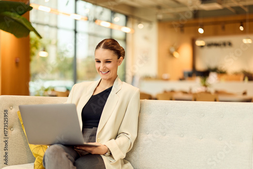 Professional Woman With Laptop In Modern Office Lobby, Working Silently And Smiling During Lunch Break