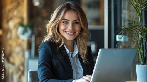 Professional woman working on laptop in modern office space, symbolizing digital work and productivity.