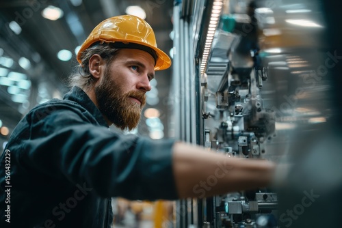 Professional worker in a hard hat working with a modern machine on a factory production line.