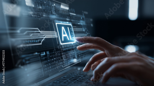 Professional working at a computer with futuristic AI interface screens, representing artificial intelligence, data analysis, digital innovation, and modern technology