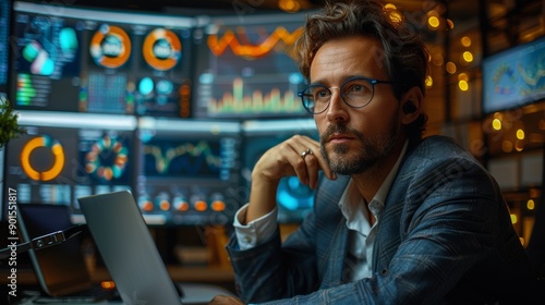 Professional Working Late in a Modern Office With Data Analytics Screens. Generative AI