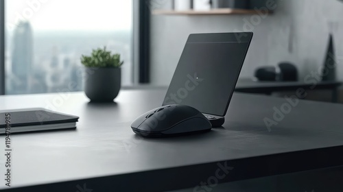 Professional workspace layout with a blank laptop screen, wireless mouse, and a small plant on a sleek table.