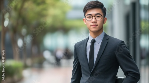 Professional young Asian male in a suit, standing confidently in a corporate office setting with a briefcase.