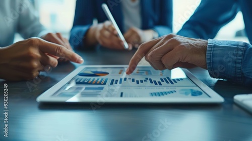 Professionals analyzing graphs on a tablet (focus on, interactive information, dynamic, Overlay, Corporate setting)