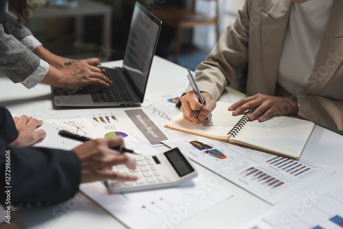 Professionals engaging in financial analysis, reviewing charts and graphs. Laptops and calculators on the table, emphasizing teamwork and data-driven decision-making in a business environment