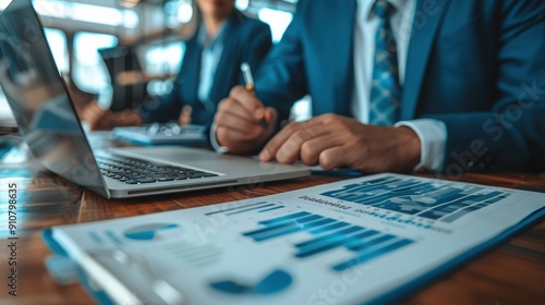 Professionals in a business meeting analyzing financial reports and data on a laptop, focused on charts and graphs.