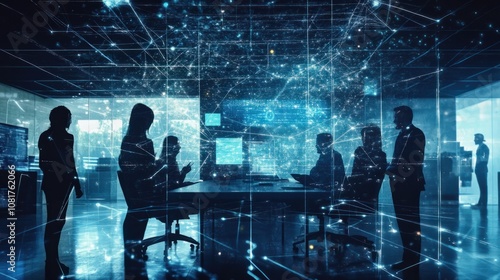 Professionals on a video call in a modern workspace, digital connections symbolizing global communication