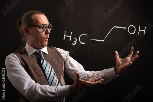 Professor presenting handdrawn chemical formula of Propanol n-propanol