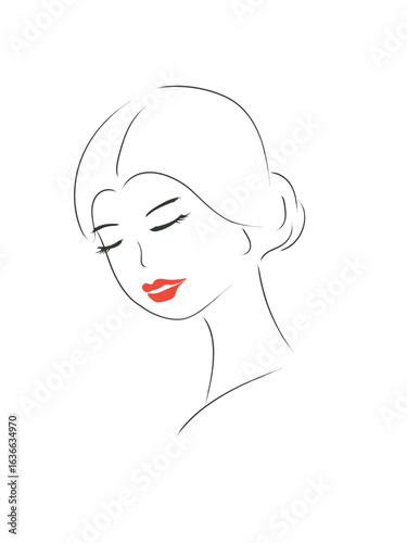 Profile of a girl in the art line style. Woman's face with closed eyes and red lips. State of light thoughtfulness, dreaminess, concentration, contemplation of the inner self. Vector lady's face logo