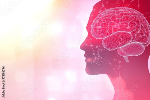 Profile of a glowing brain inside a human silhouette with vibrant pink light symbolizing neural activity creativity and cognitive enhancement in a futuristic and bright abstract setting