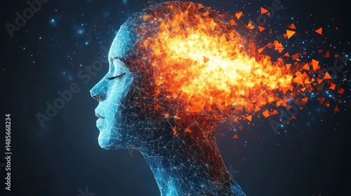 Profile of a human head composed of blue network lines with fiery orange and yellow polygonal flames erupting from the back, symbolizing intense mental activity or creativity