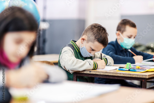 Profile of a pupil writing down schoolwork in notebook while sitting in classroom during covid 19.