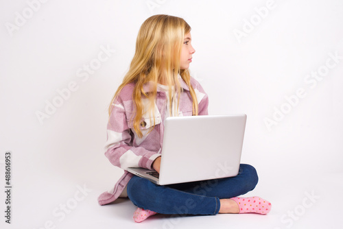 Profile of smiling caucasian teen girl sitting with laptop in lotus position on white background with healthy skin, has contemplative expression, ready to have outdoor walk.