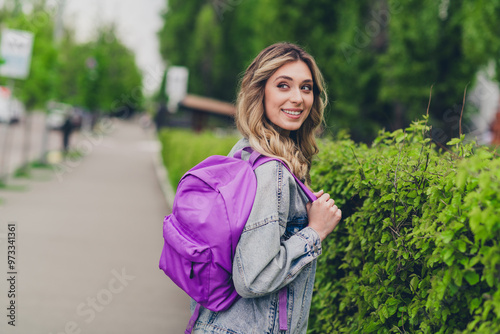 Profile photo of nice young woman backpack look away think wear denim jacket walk city center outdoors