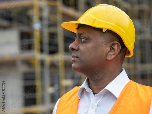 Profile portrait of a serious civil engineer or factory worker wearing a safety helmet and looking aside