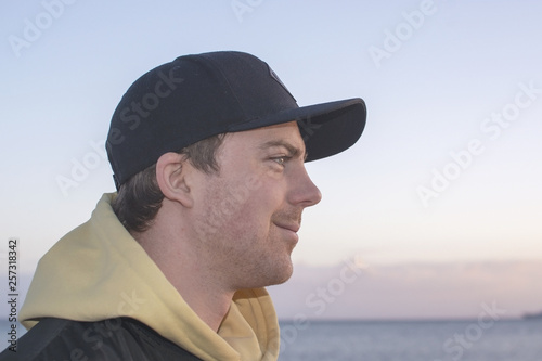 Profile shot of handsome smiling natural and casual looking male in late twenties