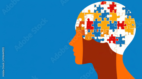 Profile silhouette of a person with a colorful puzzle piece brain illustration on a bright blue background