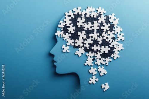 Profile view of a head silhouette, composed of scattered jigsaw puzzle pieces