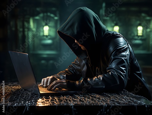 Profile view of an individual in a hooded sweatshirt and Guy Fawkes mask working on a laptop.