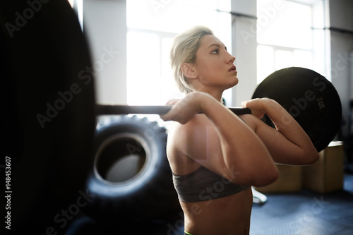 Profile view of concentrated blond-haired woman lifting barbell while having intensive training in spacious gym, waist-up portrait