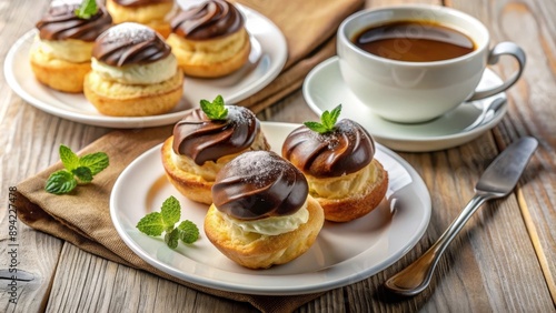 Profiteroles con cobertura de chocolate y hojas de menta, servidos con una taza de café sobre una mesa rústica. Cocina francesa.