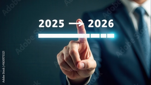 Progress and transition from 2025 to 2026 concept. A person pointing to loading bar transitioning from 2025 to 2026, progress, future planning, and new year goals. annual planning.