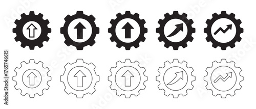 Progress Gear Icons. Black and Outline Settings Symbols with Arrows and Growth Graphs for Business, Tech, and UI Design.