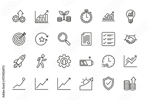 Progress outline icon set. Business growth, success, and development symbols. Chart, graph, target, rocket, and startup icons for strategy, performance and investment.