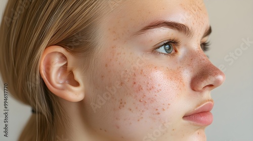 Progress shot at day 15, side profile, slight acne reduction, warm lighting, visible skin texture, high-res photography, clean background, portrait-focused