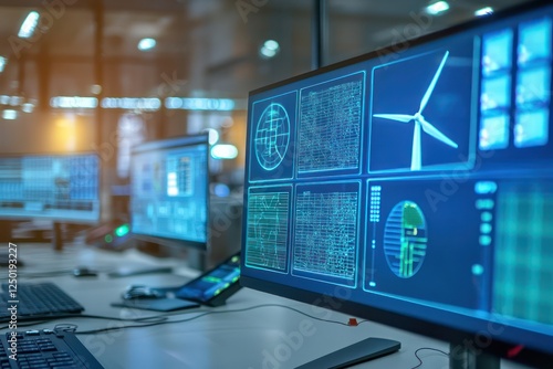 Progressive renewable energy hub, real-time holography optimizes solar and wind integration.