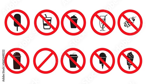 Prohibited food and drink items displayed in a grid of no-entry signs.