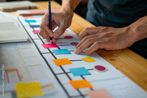 Project and task management. Man's hands organizing sticky notes on a table to keep track of the progress of project tasks