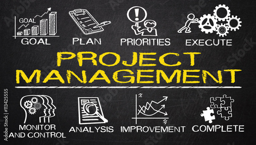 project management with business elements drawn on blackboard
