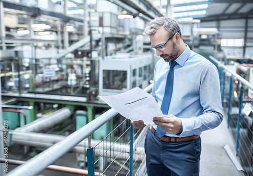 Project manager examines a blueprint in an advanced manufacturing facility with robotic arms and automation, overseeing the storage of products and materials in the warehouse