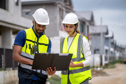 Project manager women and civil engineer wearing safety vests and helmets inspect a housing development site, discussing project progress with confidence in construction professionals.