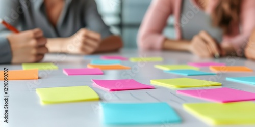 project process coordination concept. Colorful sticky notes scattered on a table during a collaborative meeting.